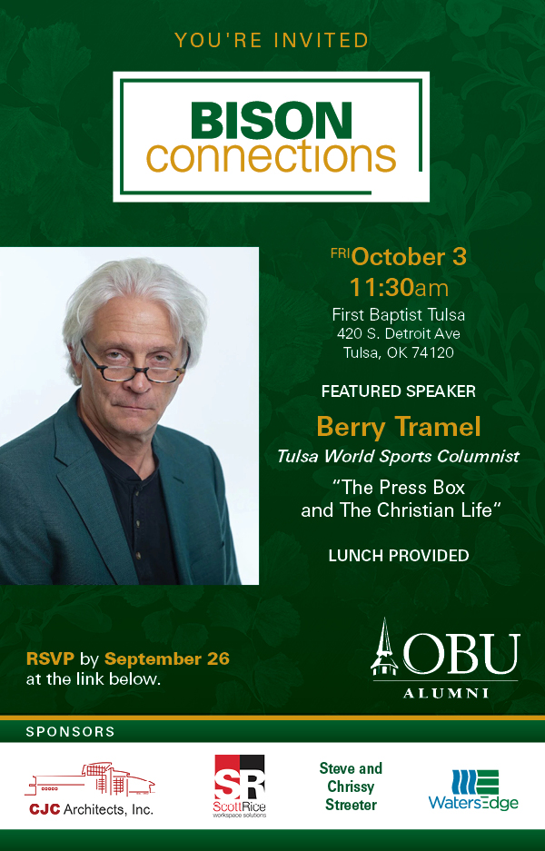 Bison Connections events offer alumni and friends the opportunity to come together in Oklahoma City, Tulsa and Shawnee to enjoy a complimentary meal (thanks to the generosity of our sponsors), network with others and hear from an inspiring Christian speaker. This is a wonderful chance to reconnect with fellow Bison and OBU!