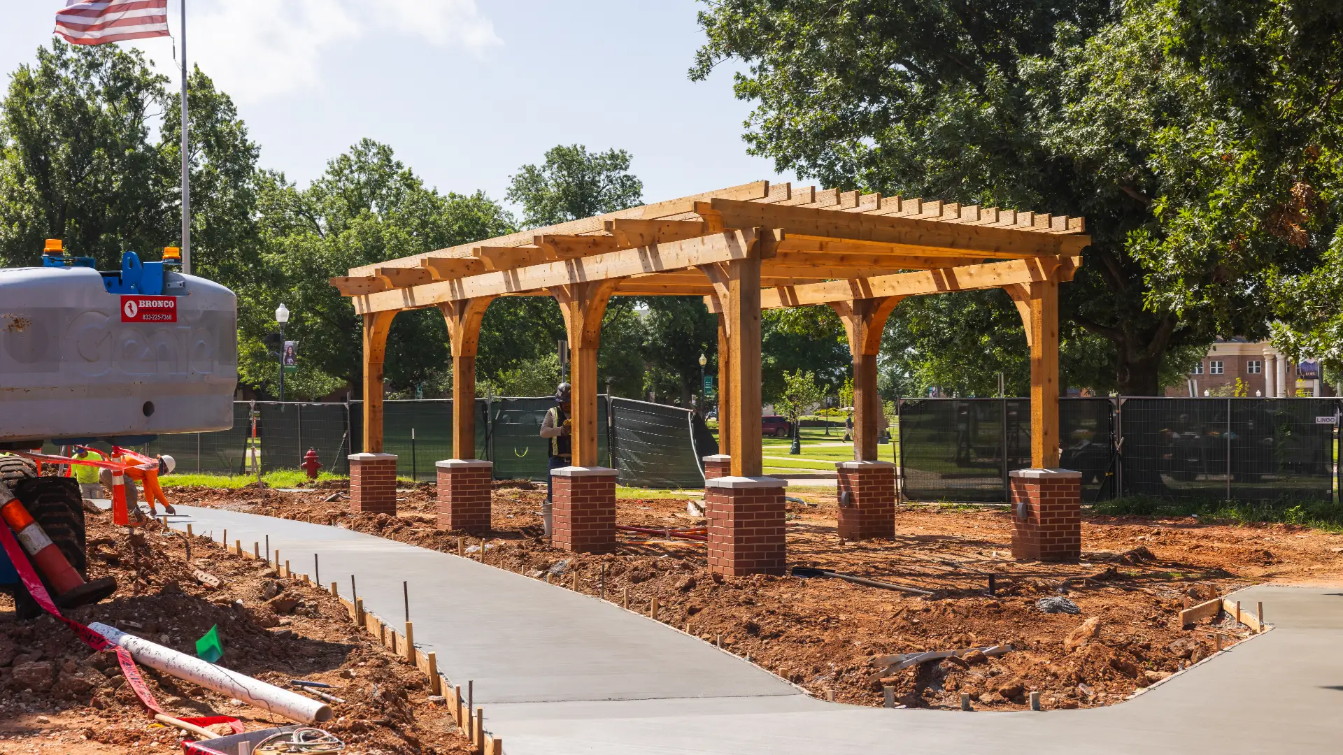 With an extended break from rainfall, exterior construction has resumed and continues to progress. The new pergola is nearly complete and installation of sidewalks, irrigation sleeves and bases for site and building lighting is underway. Site work is expected to conclude in early September, with landscaping and irrigation scheduled for late September and early October when planting conditions improve.