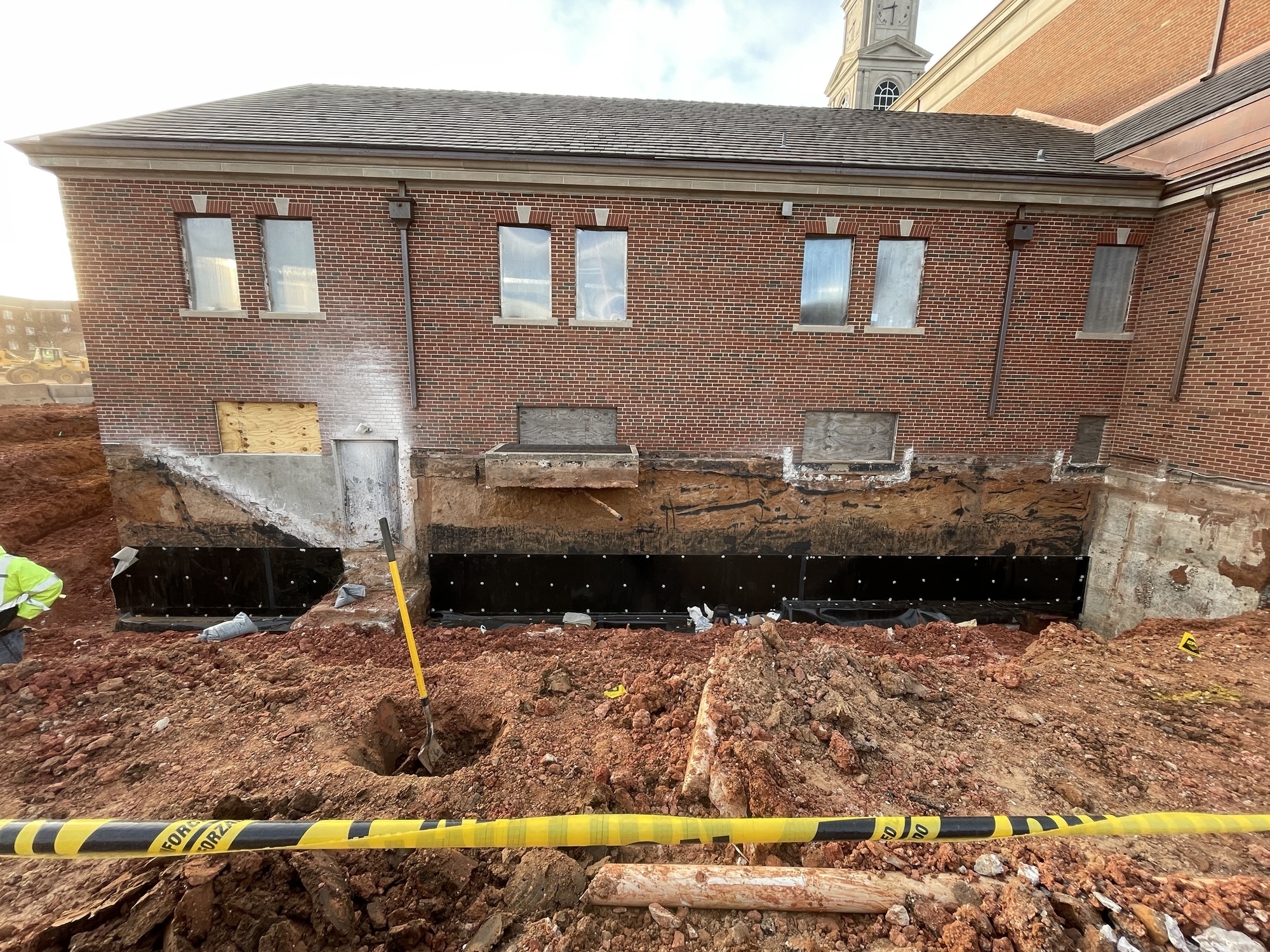 Excavation on the east side of Raley Chapel began for the waterproofing of below-ground spaces. This process, similar to work completed at Shawnee Hall and Thurmond Hall, will help prevent future moisture issues.