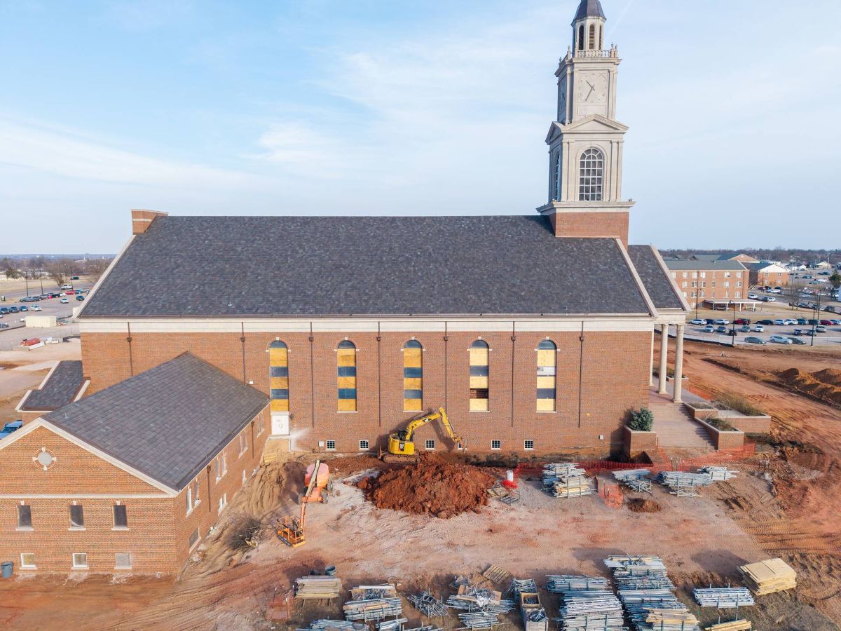 On the exterior, removal of existing trees, grounds features and monuments has taken place to allow for site redevelopment. Monuments, including the statue of Dr. John Wesley Raley, the memorial wall and the granite cross from Raley Lawn have been carefully disassembled and placed in storage for safekeeping. Each will be reinstalled in new locations on the site once work on the grounds is completed. Site grading is well underway, with pond excavation scheduled to begin in mid-February.
