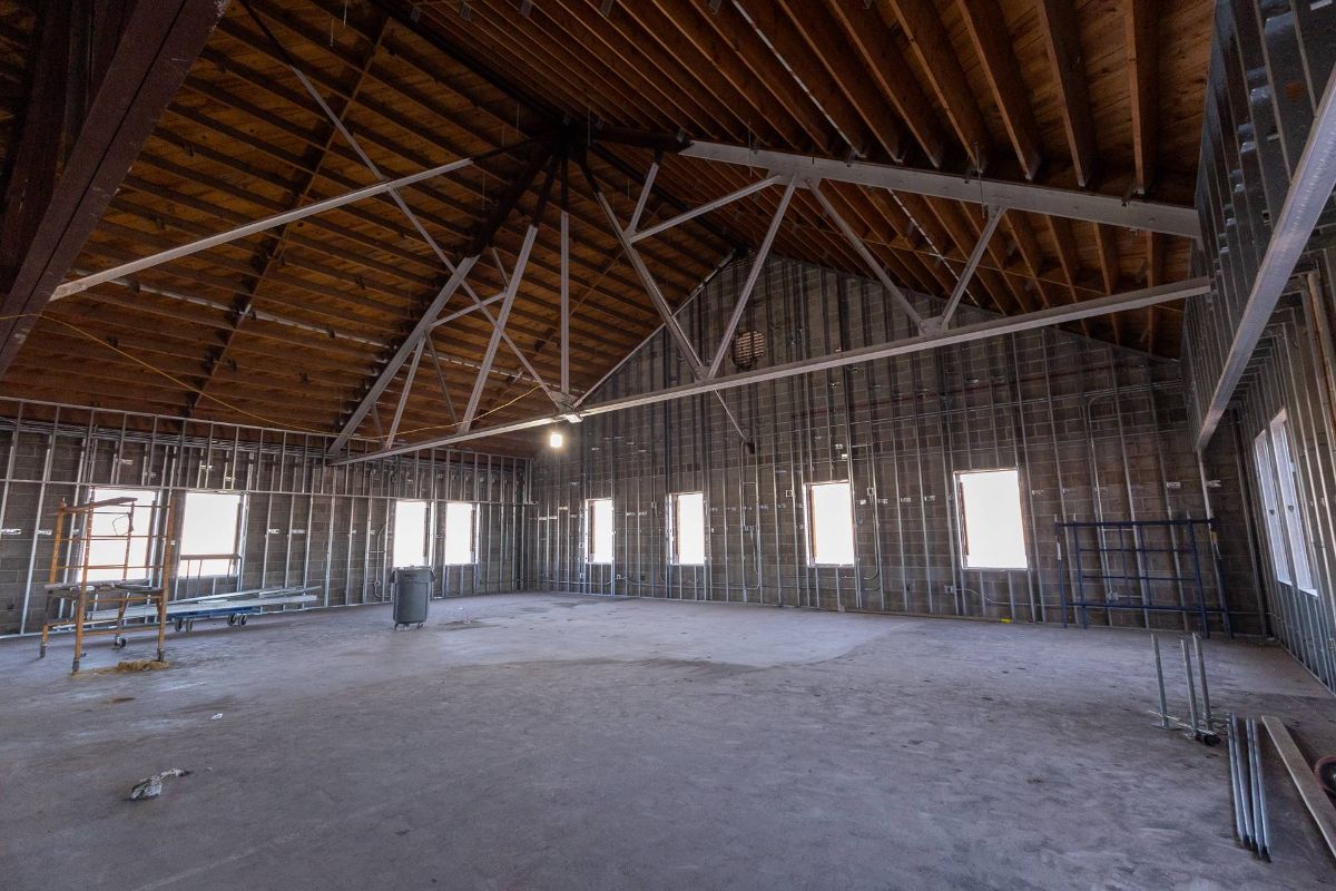 Additional interior progress includes scaffolding adjustments in Potter Auditorium and the installation of spray foam insulation in the attic to enhance climate control and acoustics. In the east wing, walls are in place for the band facility on the first floor and the choir facility on the second floor. In-wall electrical and plumbing rough-ins are complete, sheetrock has been installed and bedding and taping are beginning. Overhead mechanical systems and fire suppression rough-ins are also underway.