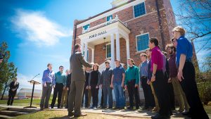 0 Views1 Min Read Share This! Facebook Twitter Google Plus Pinterest LinkedIn fh-performance Dr. Chris Mathews, dean of the Warren M. Angell College of Fine Arts, directs the Bison Glee Club during Ford Hall's dedication.
